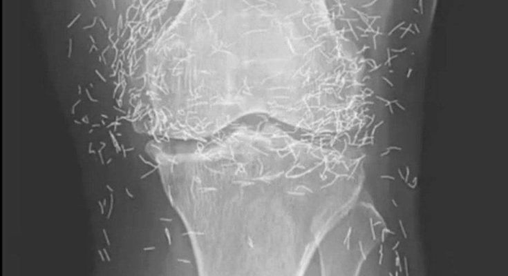Years later, when doctors took X-rays to evaluate her knee condition, they weren’t prepared for what appeared on the images. Her knees were filled with dozens of bright, metallic flecks — tiny needles embedded deep within the joint area.